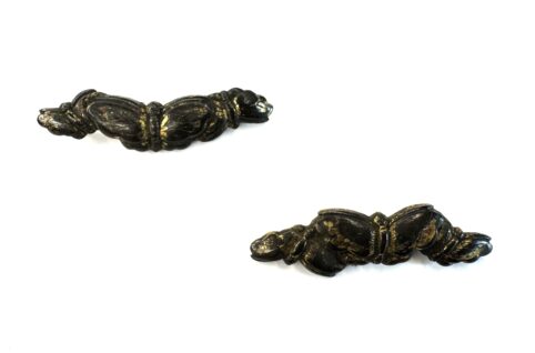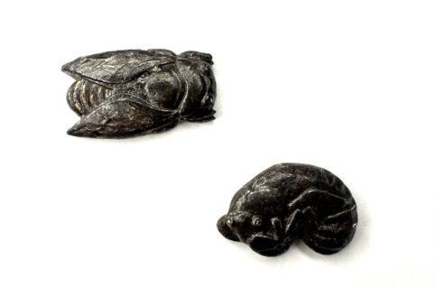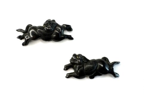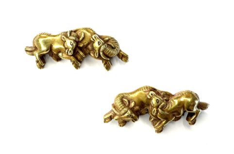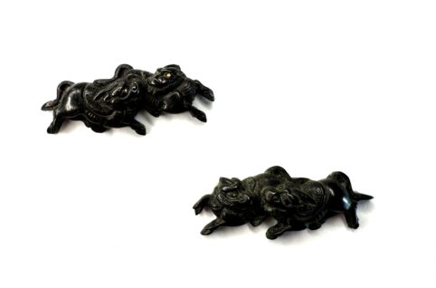 二疋犀図目貫無銘赤銅地 容彫 金色絵 長さ:33.0mm 幅:13.7mm 厚さ:5.6mm 重さ:3.7g長さ:34.1mm 幅:13.7mm 厚さ:5.6mm 重さ:3.9g