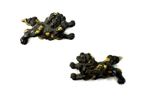 獅子図目貫無銘赤銅地 容彫 金色絵 長さ:30.8mm 幅:15.4mm 厚さ:5.6mm 重さ:4.3g長さ:32.0mm 幅:16.4mm 厚さ:5.3mm 重さ:5.1g