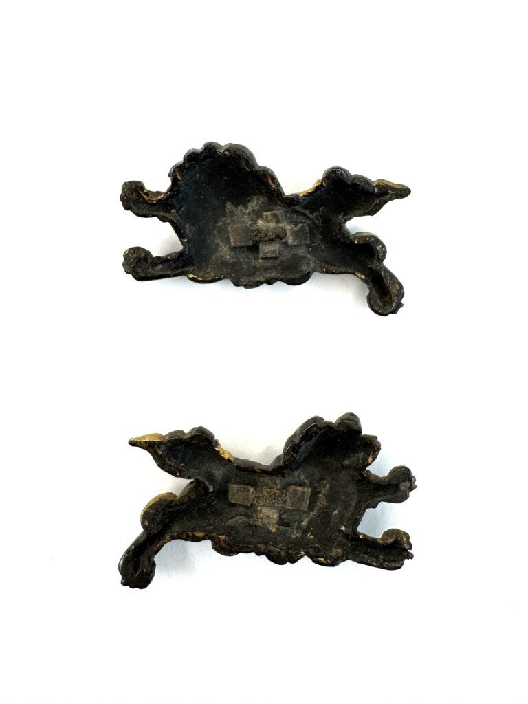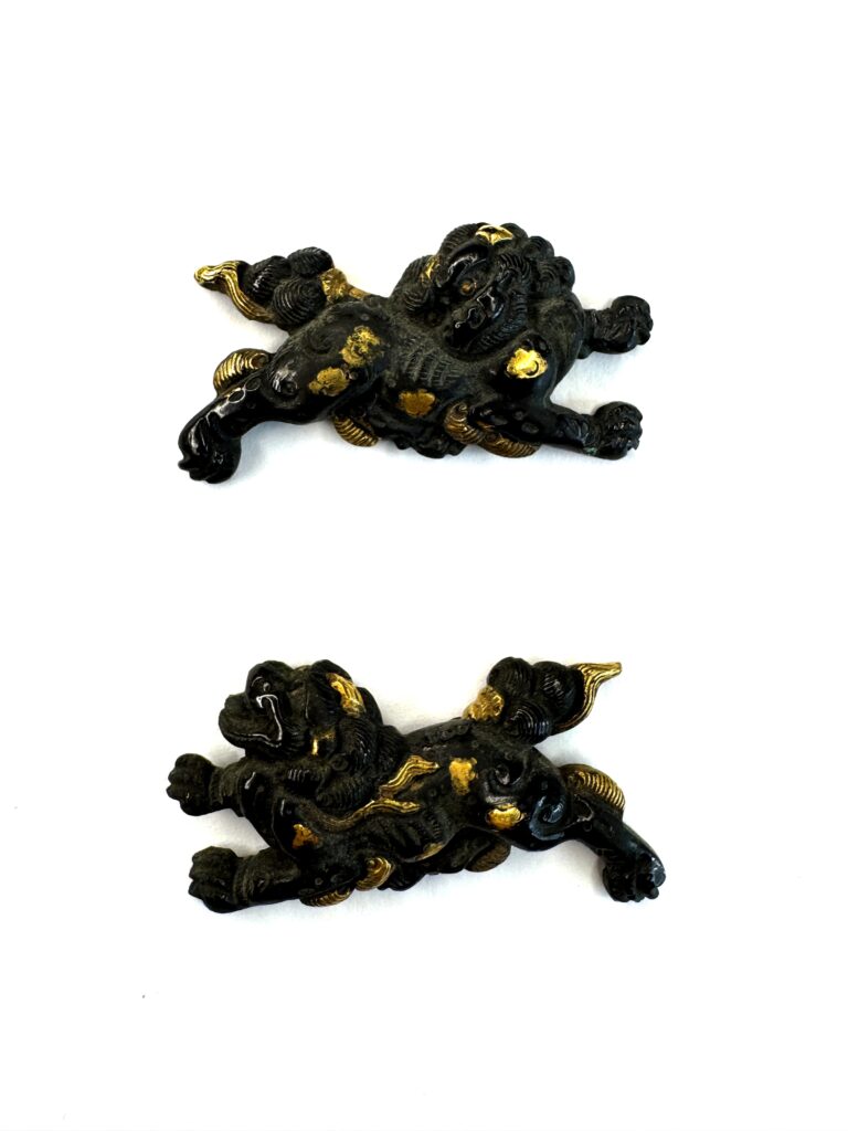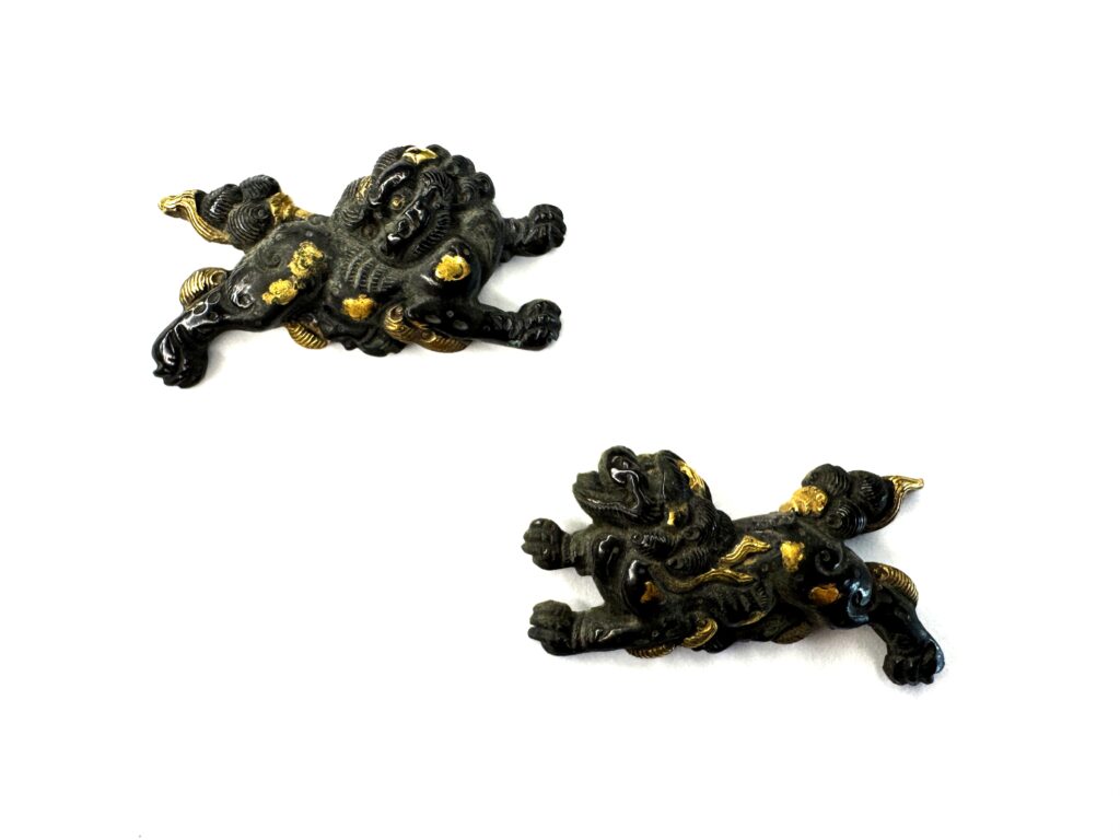 刀装具 獅子図目貫 2026年4月9日 by toma 獅子図目貫無銘赤銅地 容彫 金色絵 長さ:30.8mm 幅:15.4mm 厚さ:5.6mm 重さ:4.3g長さ:32.0mm 幅:16.4mm 厚さ:5.3mm 重さ:5.1g 刀装具:目貫, 動物の意匠, 獅子, 目貫