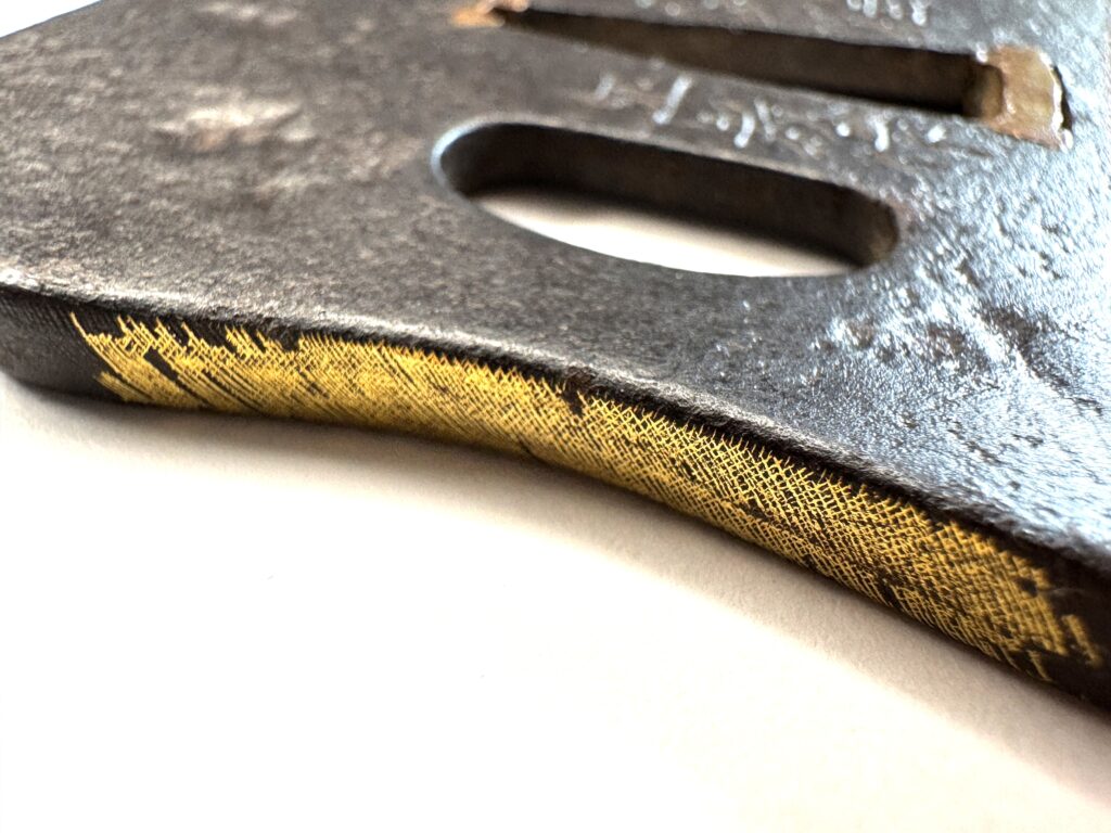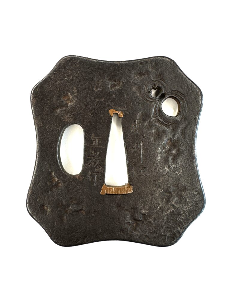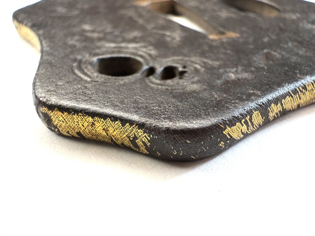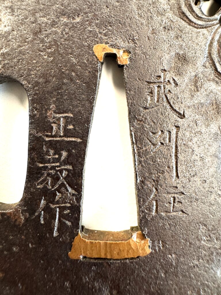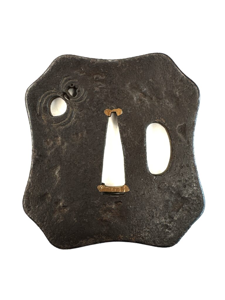 刀装具 蜘蛛図鐔 2026年4月9日 by toma 蜘蛛図鐔武州住正教作鉄地 金色絵 長さ:62.3mm 幅:58.4mm 厚さ:4.5mm 重さ:72.3g 刀装具:鐔, 動物の意匠, 蜘蛛, 鍔, 鐔