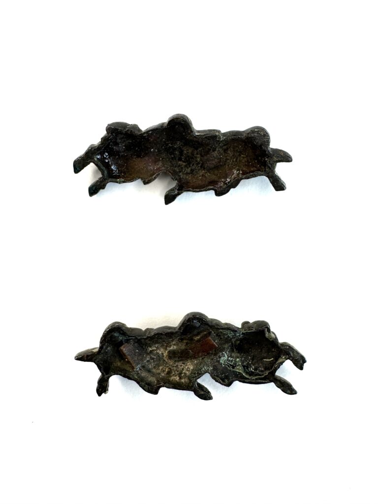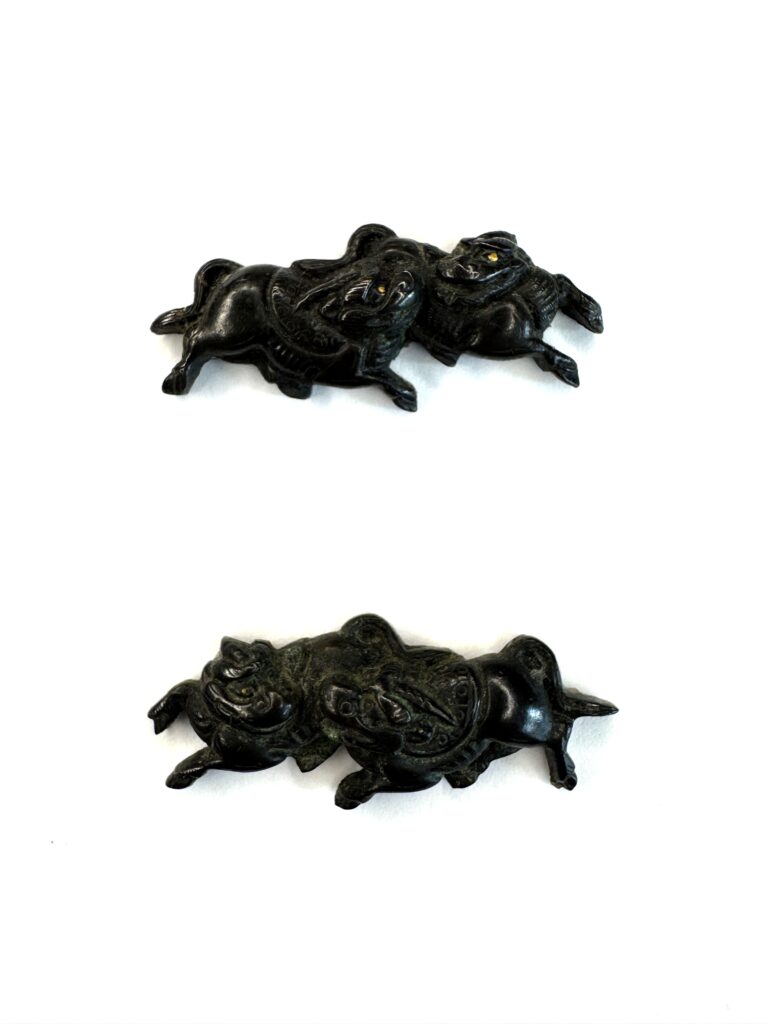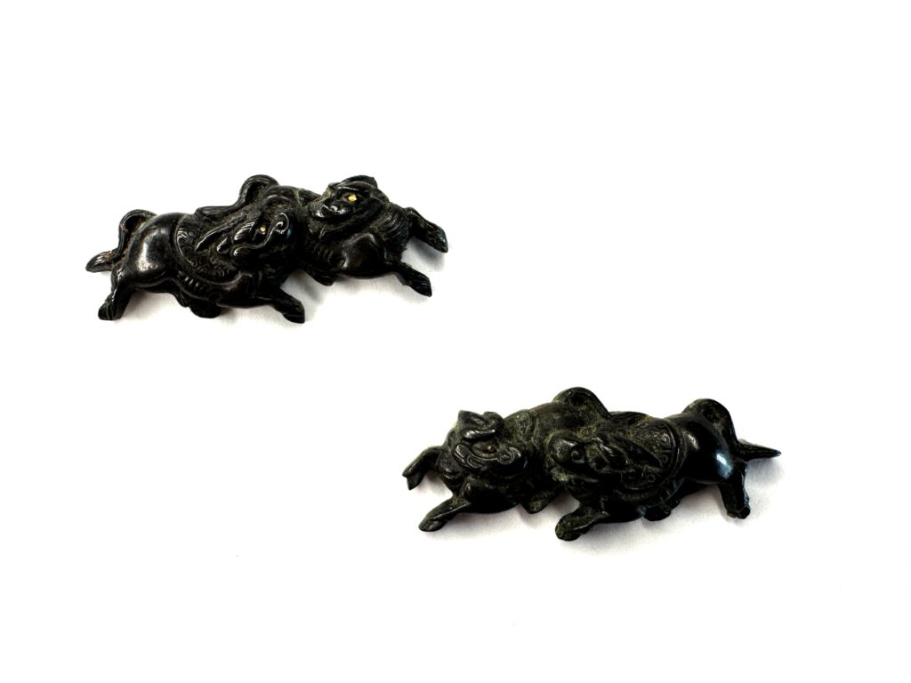 刀装具 二疋犀図目貫 2026年4月9日 by toma 二疋犀図目貫無銘赤銅地 容彫 金色絵 長さ:33.0mm 幅:13.7mm 厚さ:5.6mm 重さ:3.7g長さ:34.1mm 幅:13.7mm 厚さ:5.6mm 重さ:3.9g 刀装具:目貫, 動物の意匠, 犀, 目貫