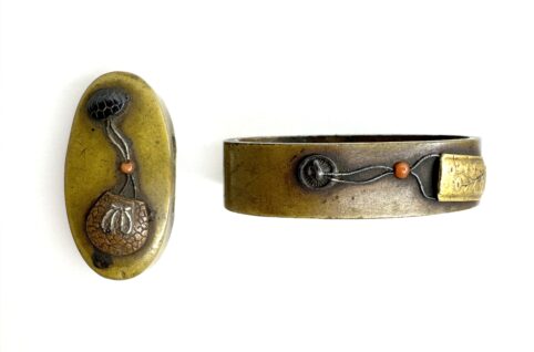 提物図縁頭無銘真鍮地 金銀色絵 長さ:37.5mm 幅:22.8mm 厚さ:9.6mm 重さ:17.9g長さ:33.0mm 幅:16.3mm 厚さ:8.1mm 重さ:9.8g