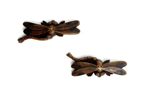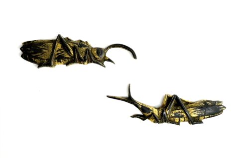飛蝗図目貫無銘山銅地 容彫 金色絵 長さ:49.9mm 幅:14.4mm 厚さ:4.6mm 重さ:4.1g長さ:51.1mm 幅:20.7mm 厚さ:4.0mm 重さ:3.6g