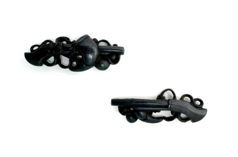 火縄銃図目貫無銘赤銅地 容彫 長さ:40.5mm 幅:15.9mm 厚さ:6.1mm 重さ:5.1g長さ:40.3mm 幅:15.1mm 厚さ:5.5mm 重さ:4.5g